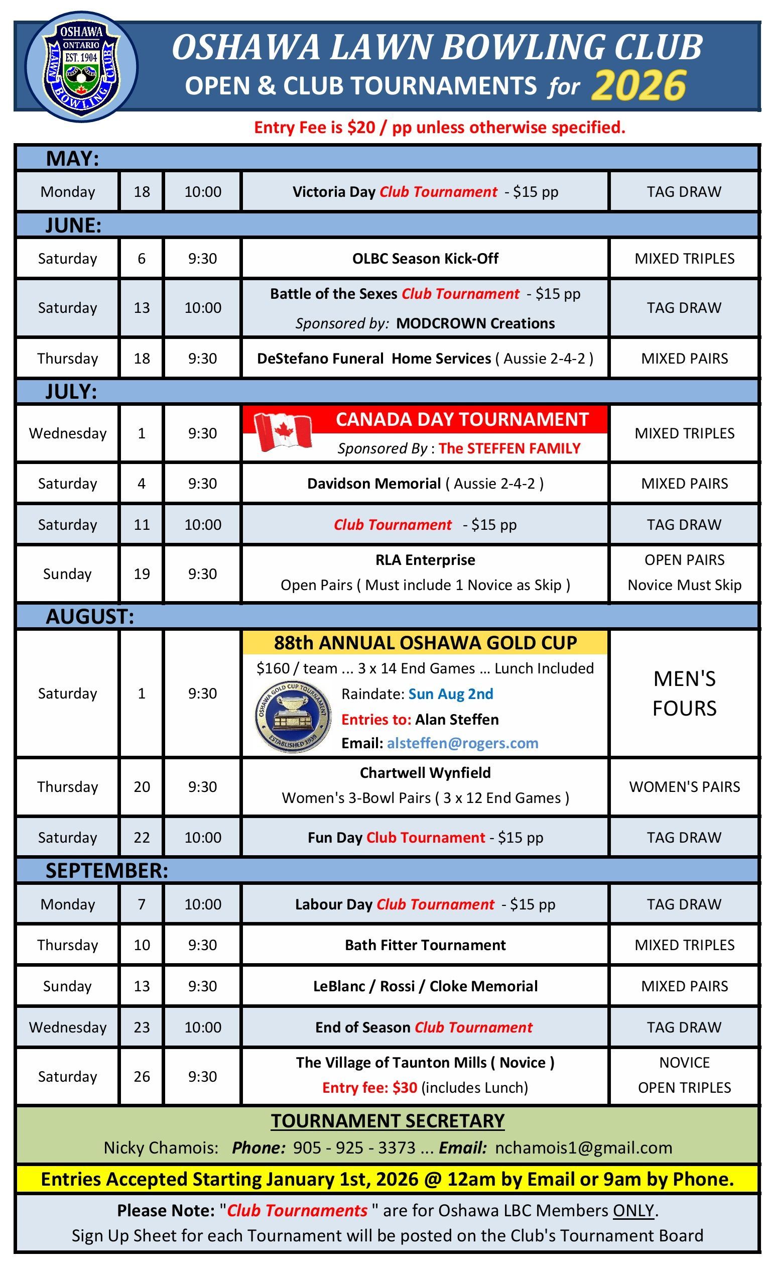From May 18 to late September, we host a variety of tournaments including the Gold Cup men's fours tournament which attracts teams from across the province, a novice open triples tournament, and monthly club tournaments, jitneys and fun days. See the details below.